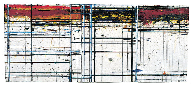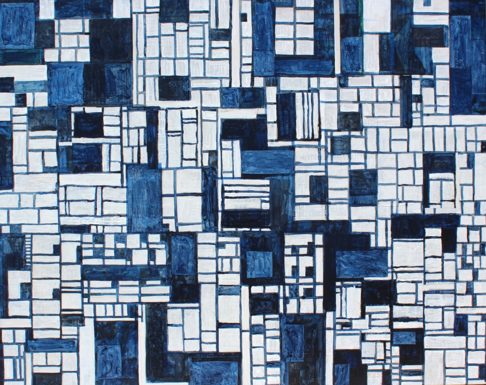 As a collage artist, Cecil Touchon is accustomed to working with found materials.This painting is designed from pieces of Chinese language newspaper from Los Angeles, CA that was received as packing matieral for acrylic paints from Nova Color paint company. Touchon saw the material as having interesting compositional possibilities and used the grid structure of the newspaper sheets to create this composition.